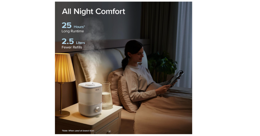 The 2.5 liter tank provides long continuous run times — I usually get around 20–25 hours on the low setting before needing a refill. The cool mist feels gentle and evenly distributed, perfect for bedrooms, the nursery, and even around houseplants. Humidity levels stay comfortable, even overnight.